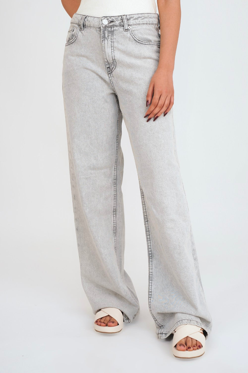 Features: Classic high-waisted design with traditional five-pocket styling and a clean, seamless hem.