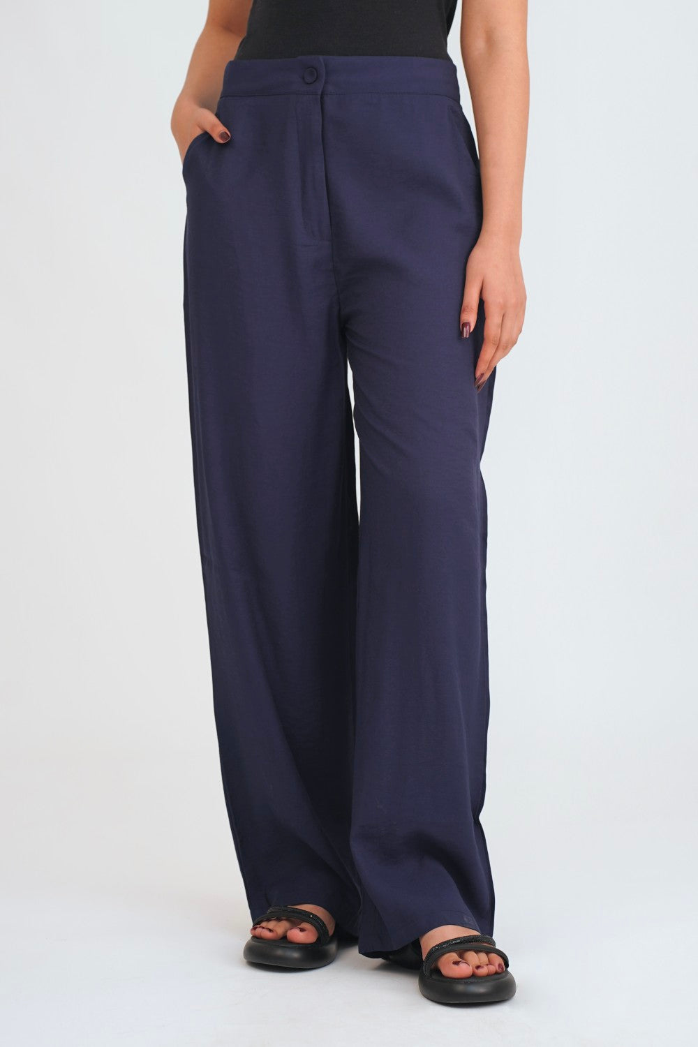 Features: Designed with a high-waisted fit and subtle pleating at the front to create a structured yet fluid look.