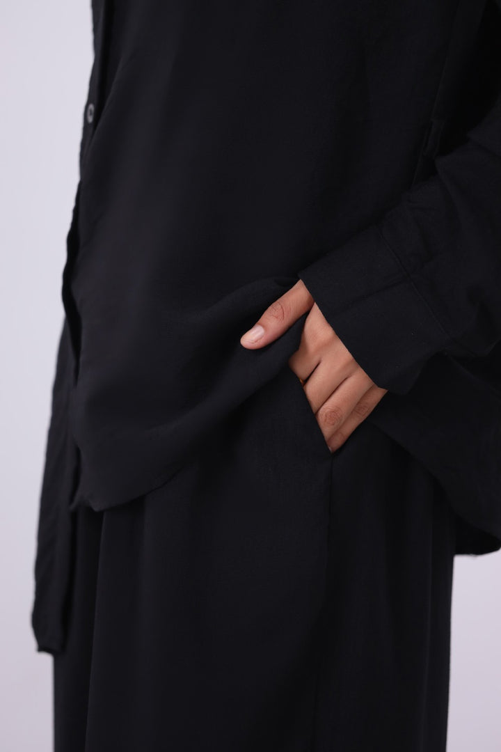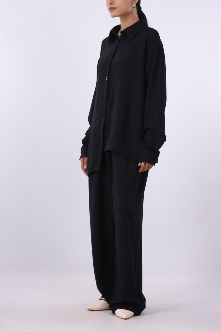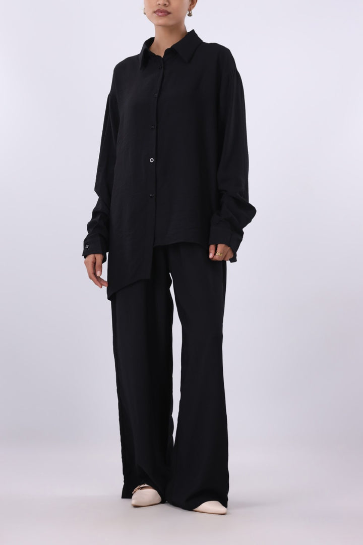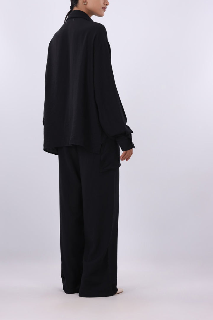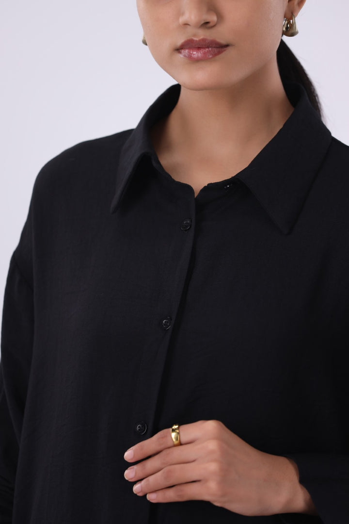 Relaxed fit woven button up shirt with regular collar, fabricated belt detail and long cuffed sleeves