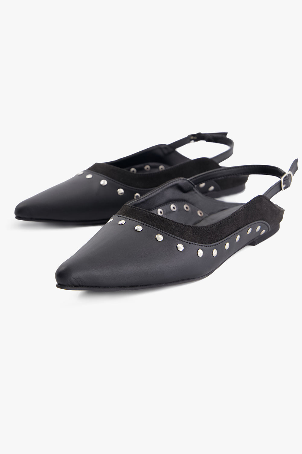 A matte black pointed-toe slingback flat featuring a suede vamp band and subtle metal studs. Finished with an adjustable strap for a secure fit.