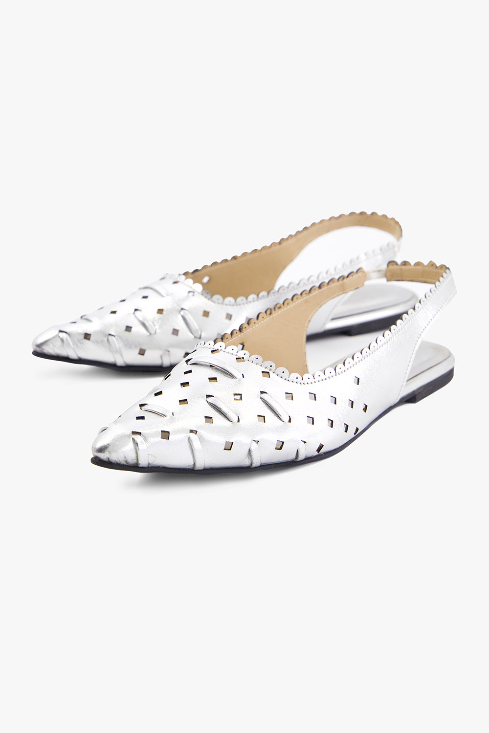 A sleek pointed-toe slingback crafted from mirror-finish silver leather. Completed with scalloped detailing and subtle star-shaped studs for added dimension.