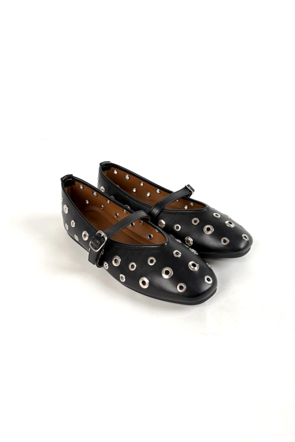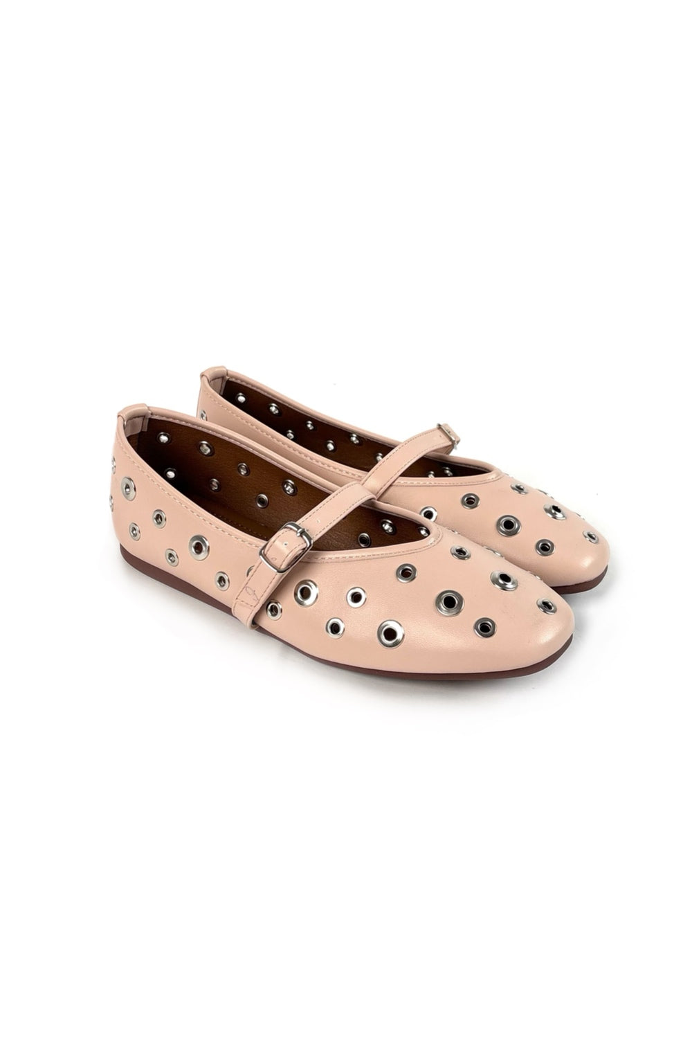 A bold reimagining of a timeless silhouette. The Rivet Mary Jane balances the sweet charm of a ballet flat with the raw energy of metallic eyelet detailing. Featuring an adjustable slim strap and a low-profile sole.