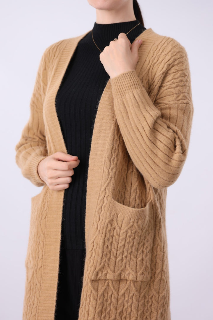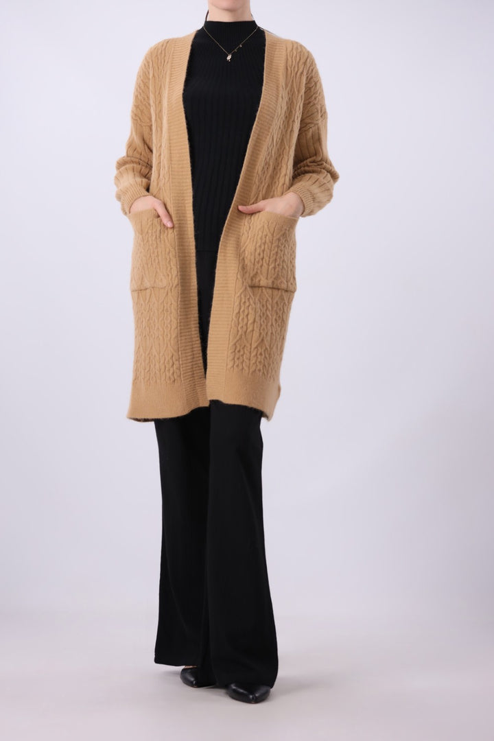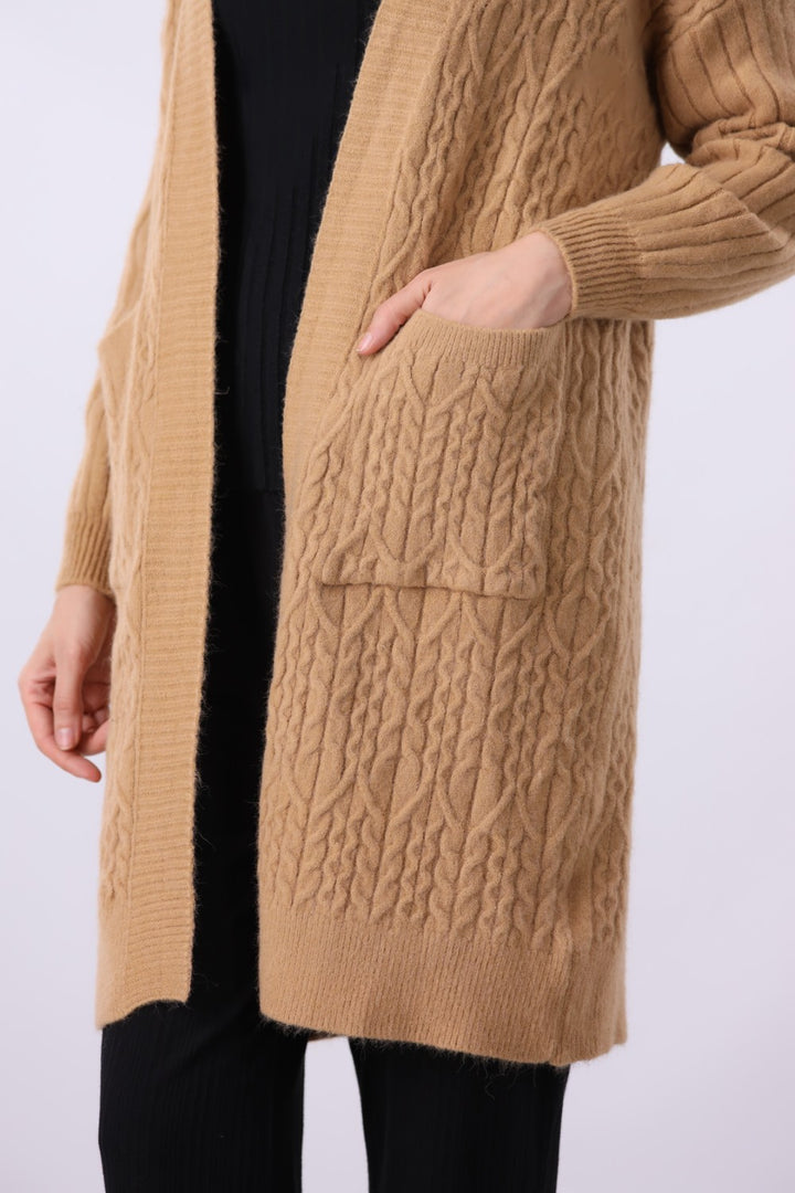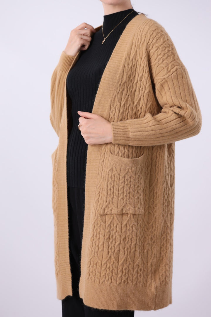 Relaxed fit cable knit open front long cardigan with front pockets and long sleeves