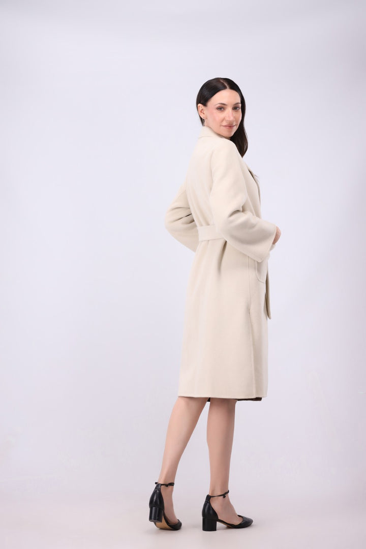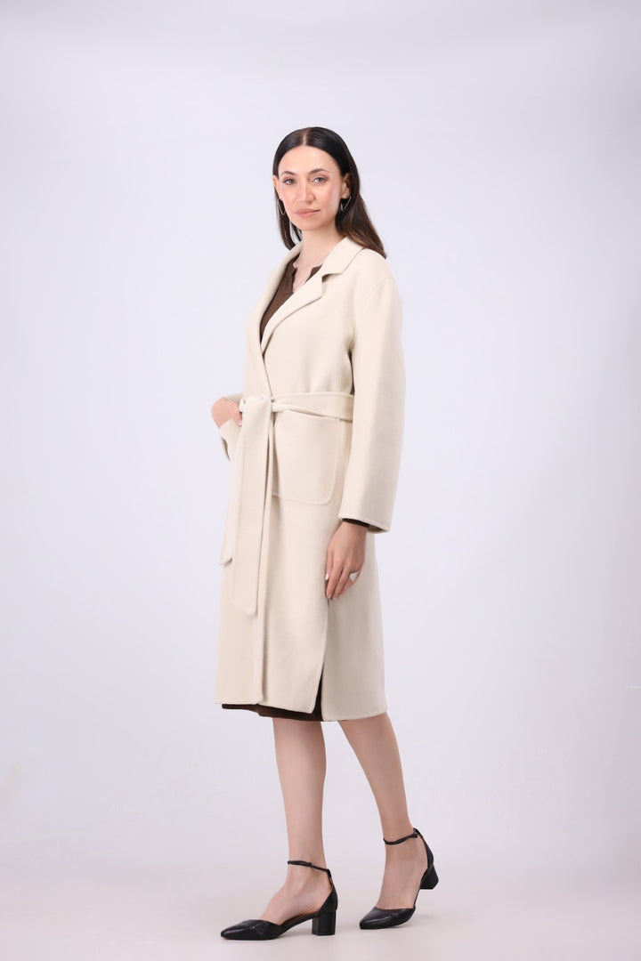 Wool relaxed fit long coat with front patch pockets, lapel collar and waist belt