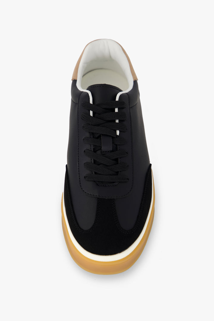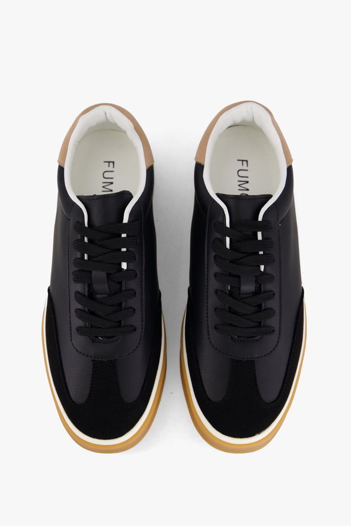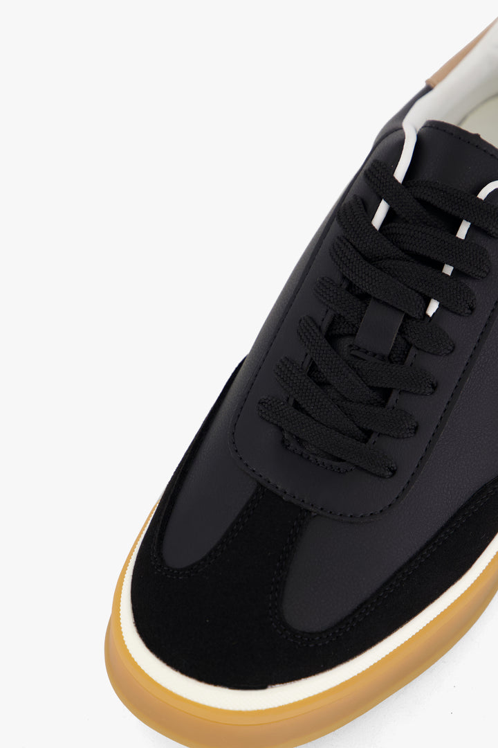 Channeling vintage athletic aesthetics, these retro-style sneakers in Black feature a dynamic mix of materials on the upper, offering both texture and visual appeal. The contrasting color sole adds a bold touch, enhancing the classic si