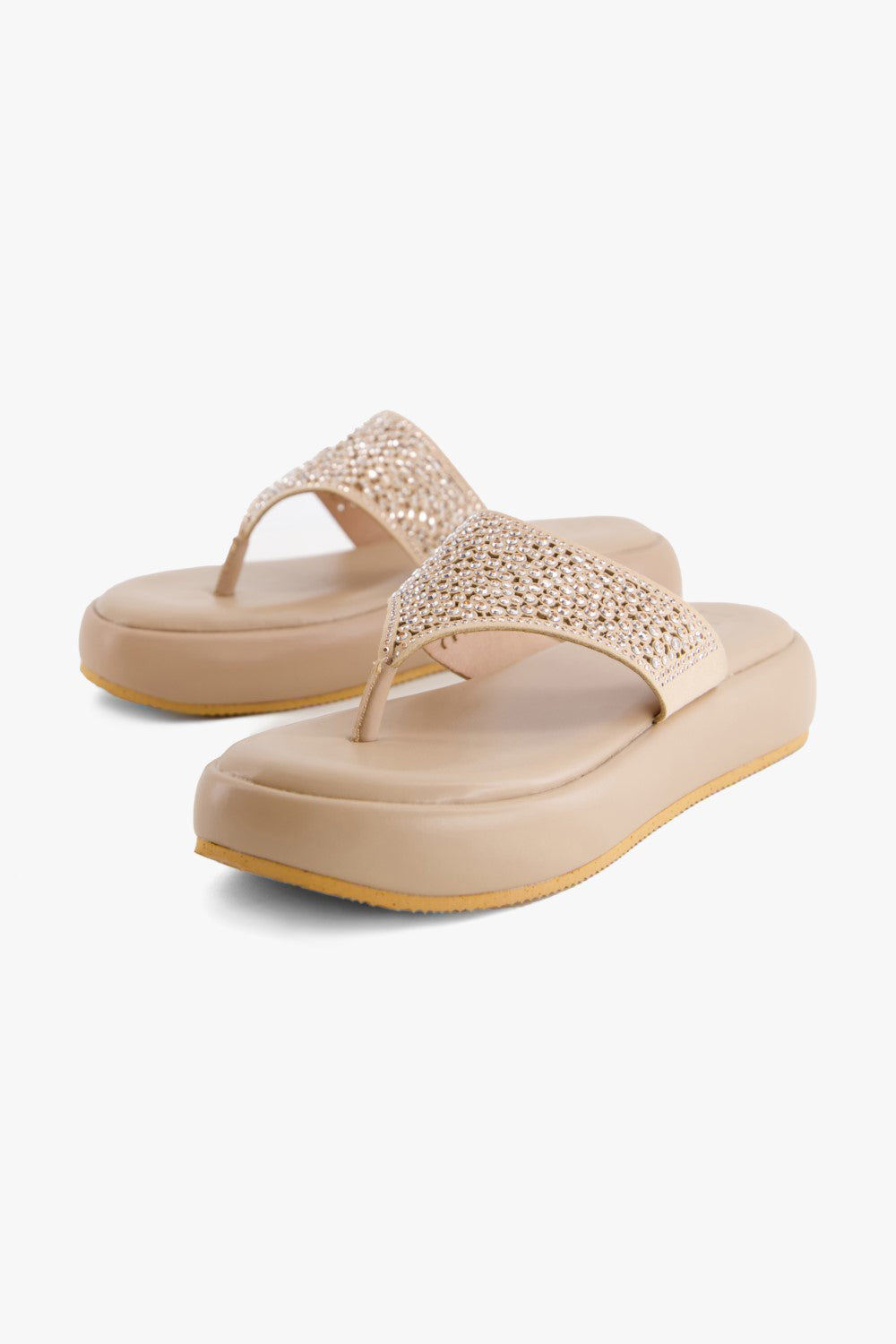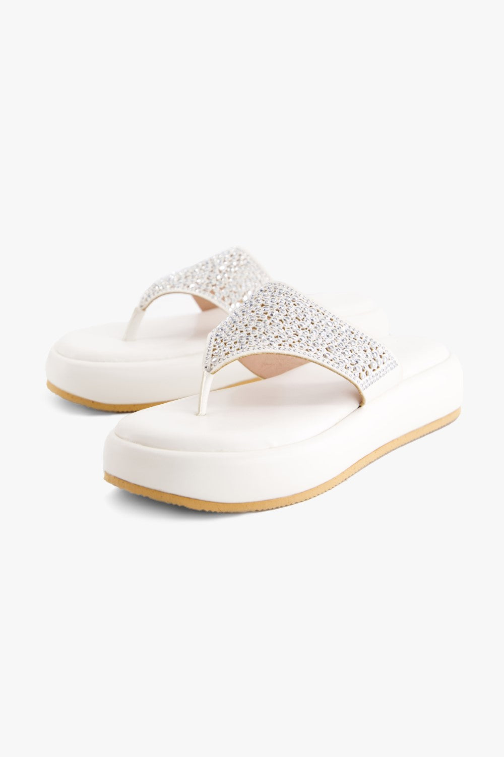 Bring elegance with these embellished toe loop flats, designed to add a touch of glamour to any outfit. The luxurious embellishments on the strap provide a stunning sparkle, while the high sole ensures comfort and support throughout the day. Make these sandals an effortlessly chic addition to your wardrobe.