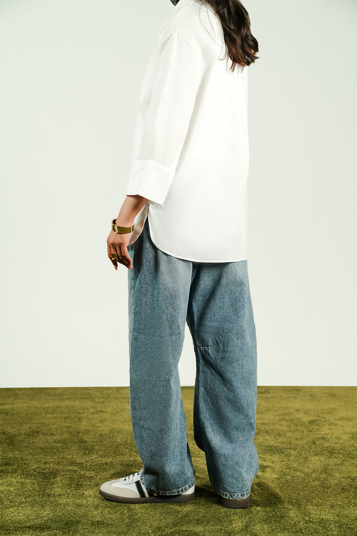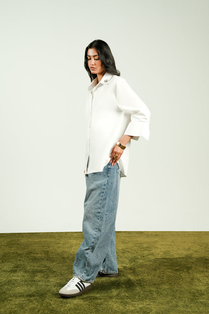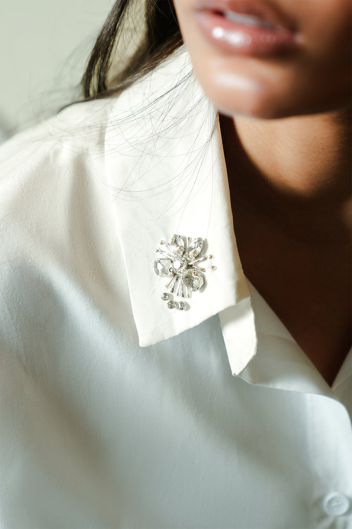 A timeless silhouette meets subtle shine in this embellished poplin shirt, crafted from soft cotton yarn for a crisp yet comfortable finish. Designed with a lapel collar and long sleeves, it features delicate embellishment at the collar