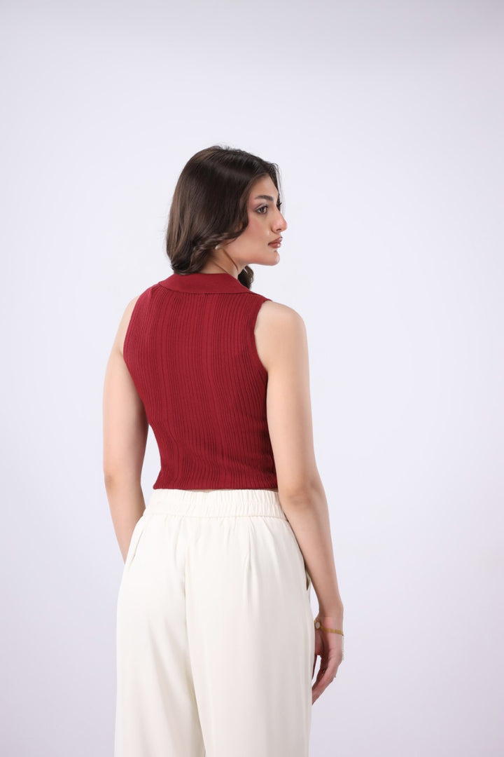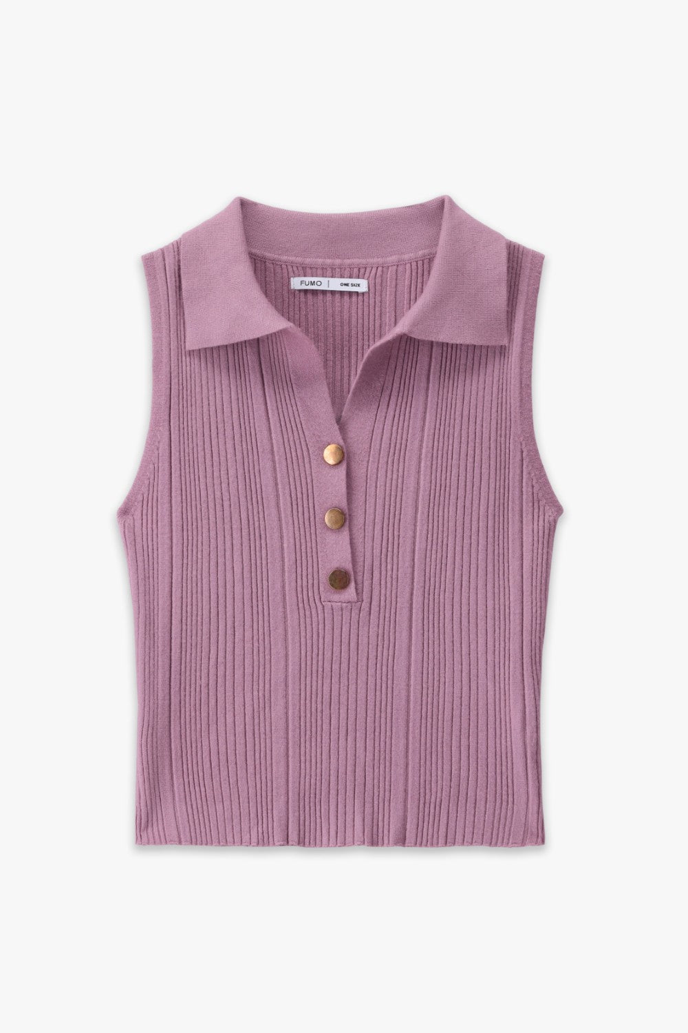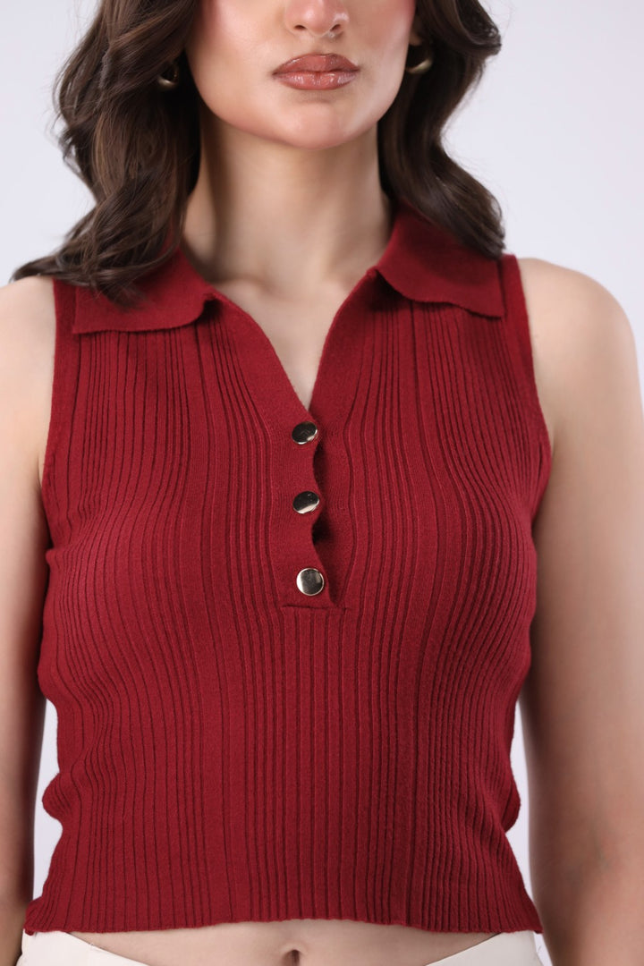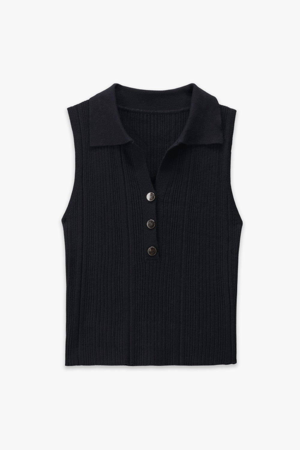 Slim fit sleeveless collared ribbed polo top with front button placket