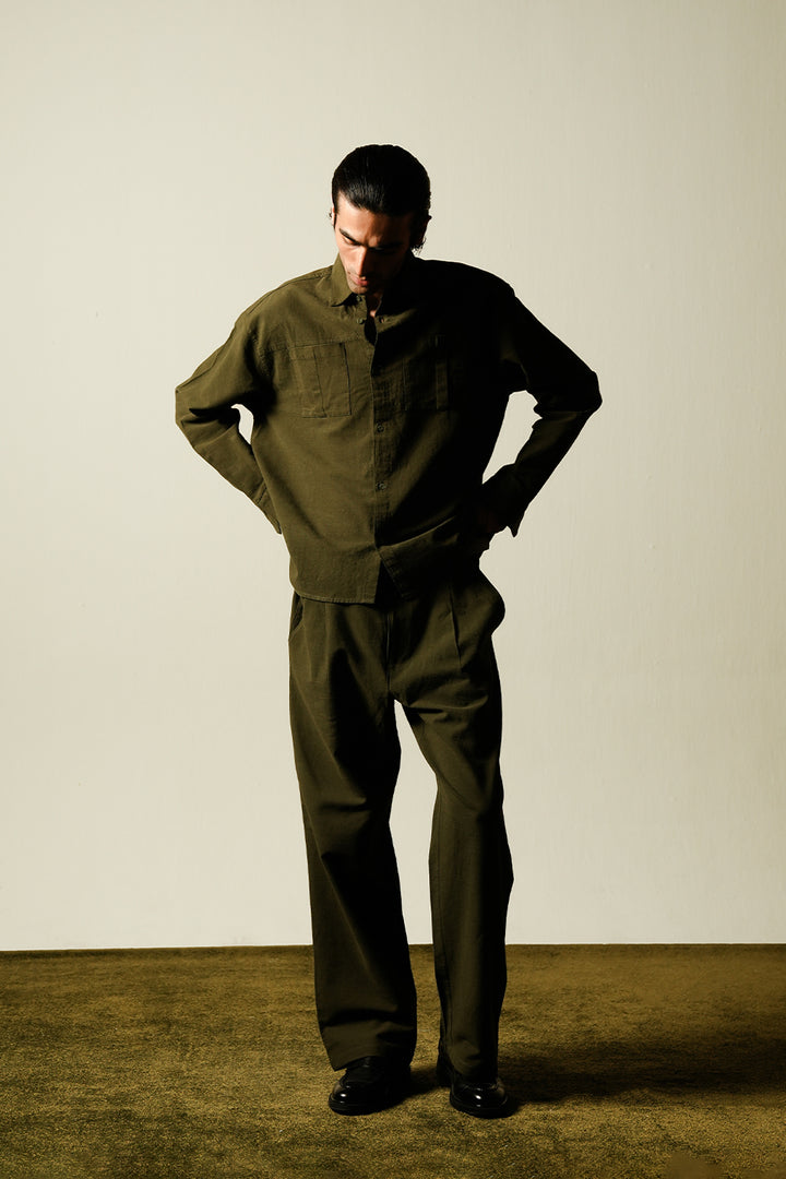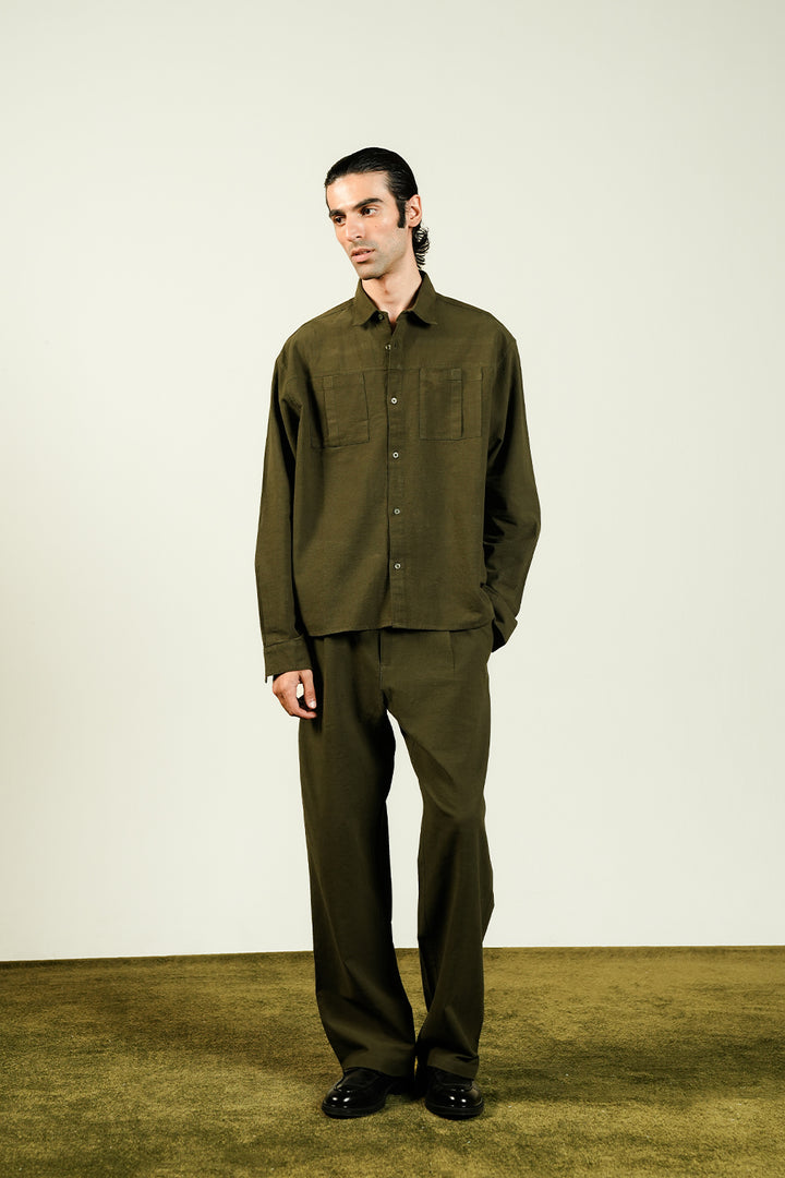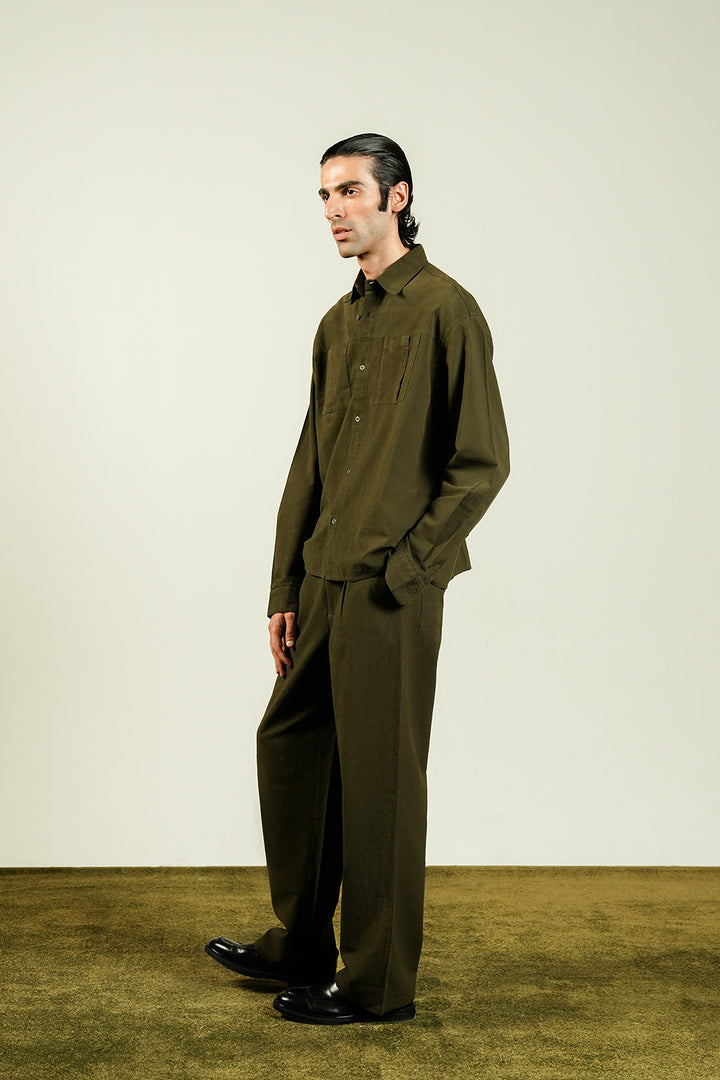 Understated and fluid, this shirt features a relaxed drop-shoulder cut with a classic lapel collar and long sleeves. Buttoned cuffs and a front button closure add clean structure, while the soft drape makes it an easy staple for both ef