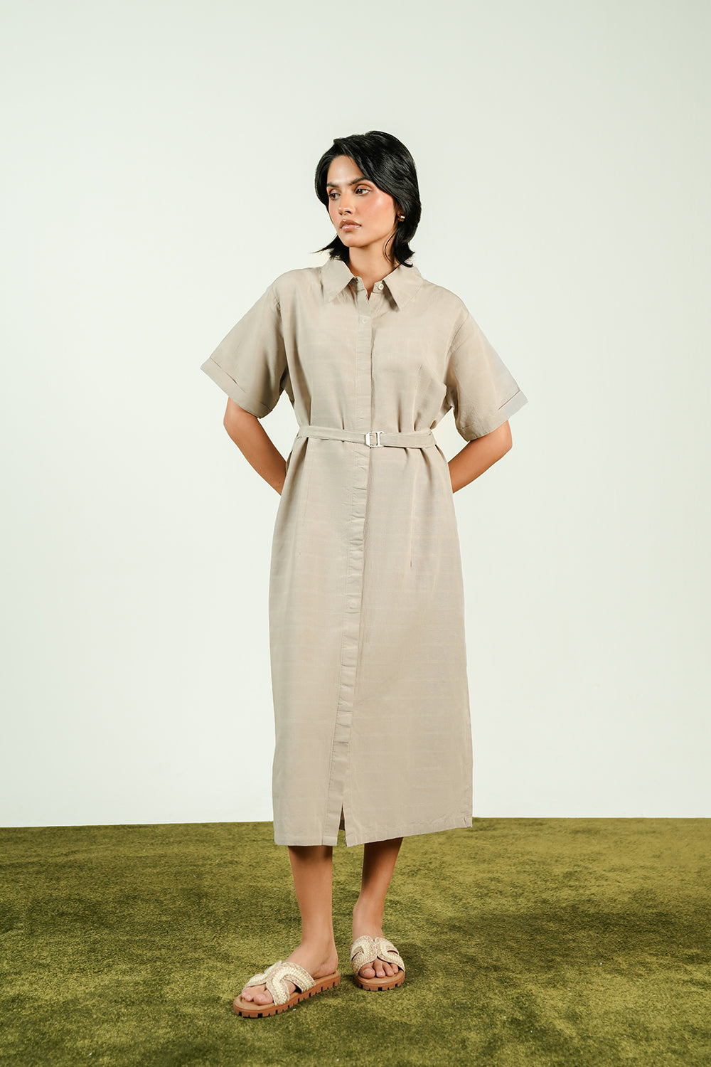 Elevated in its simplicity, this maxi shirt dress is designed with clean lines and a fluid silhouette. Featuring a front button closure, long sleeves, and a matching belt, it balances structure with flow for a look that's effortlessly p