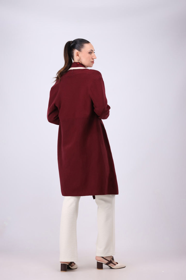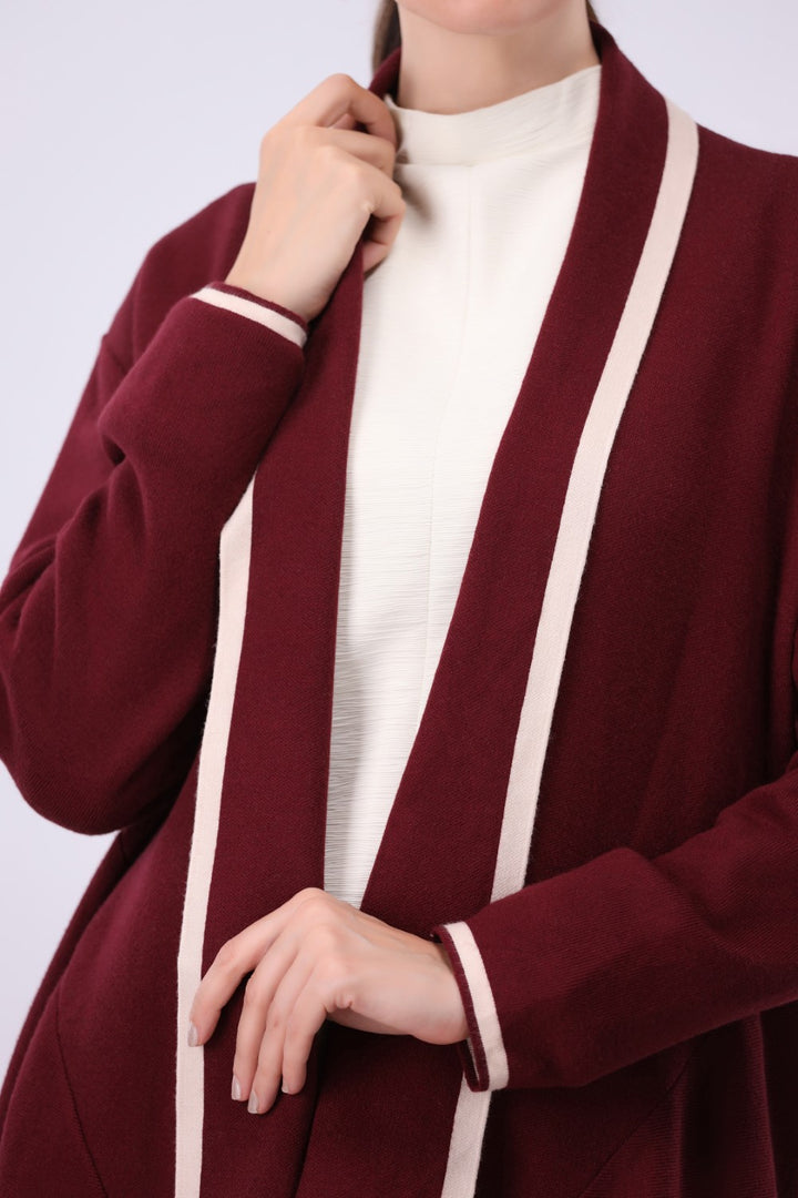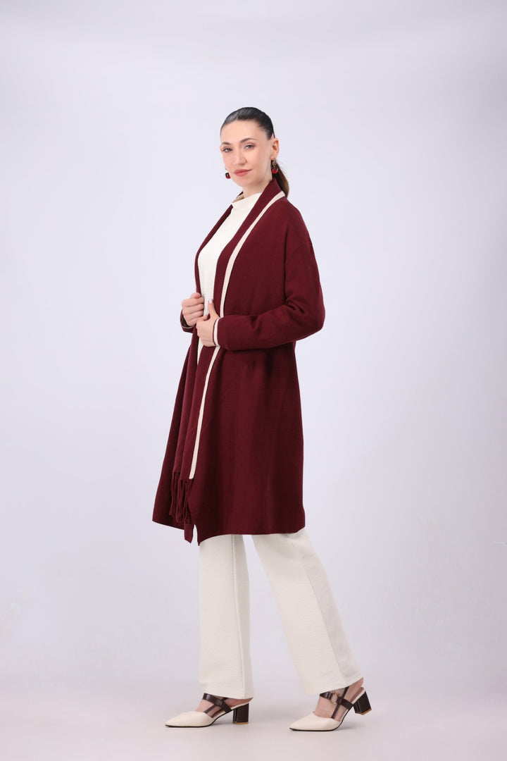 KNITTED OPEN FRONT LONG RELAXED FIT CARDIGAN WITH FRINGED HEM DETAIL, CONTRAST TRIMS AND LONG SLEEVES
