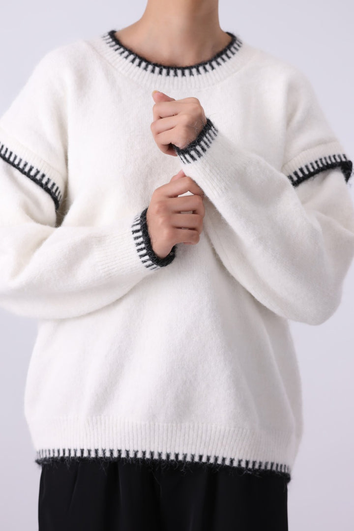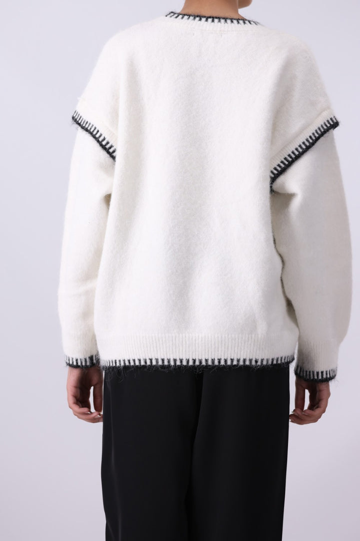 LOOSE FIT BRUSHED KNIT CARDIGAN WITH CONTRAST BLANKET STITCH DETAIL WITH ROUND NECKLINE AND LONG SLEEVES