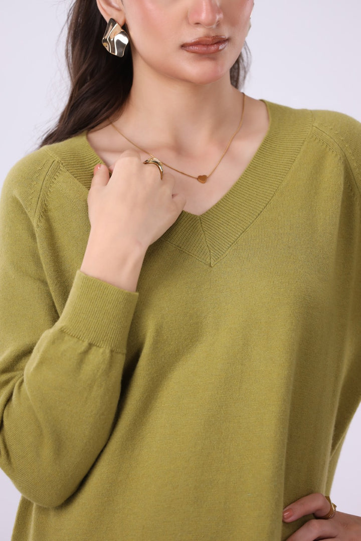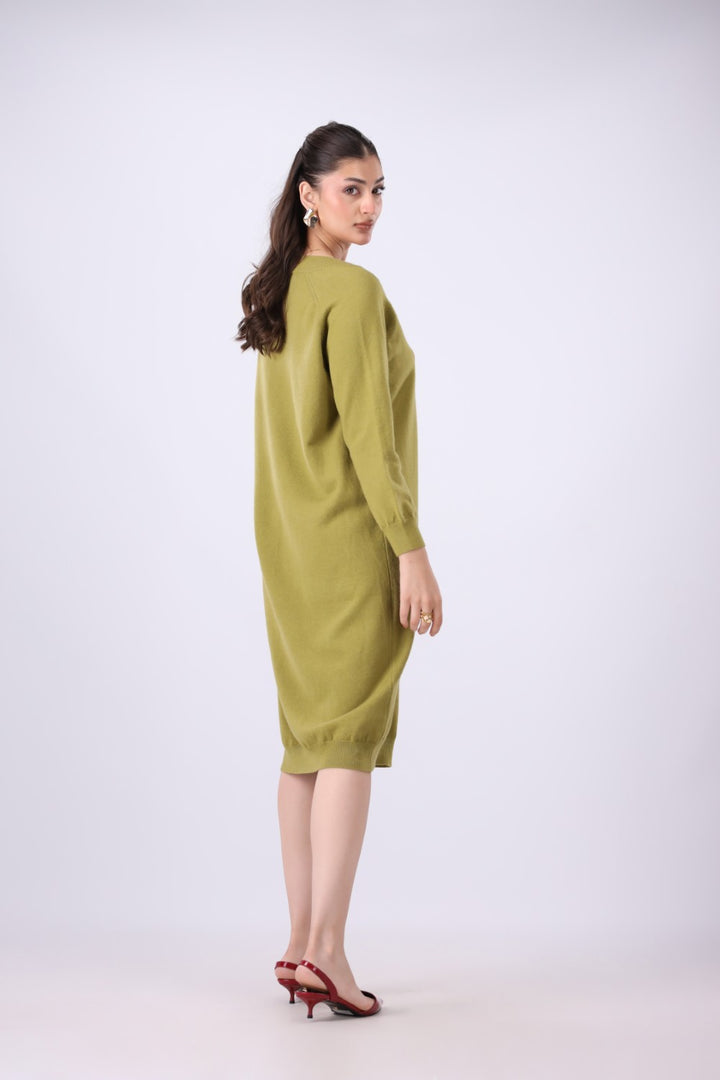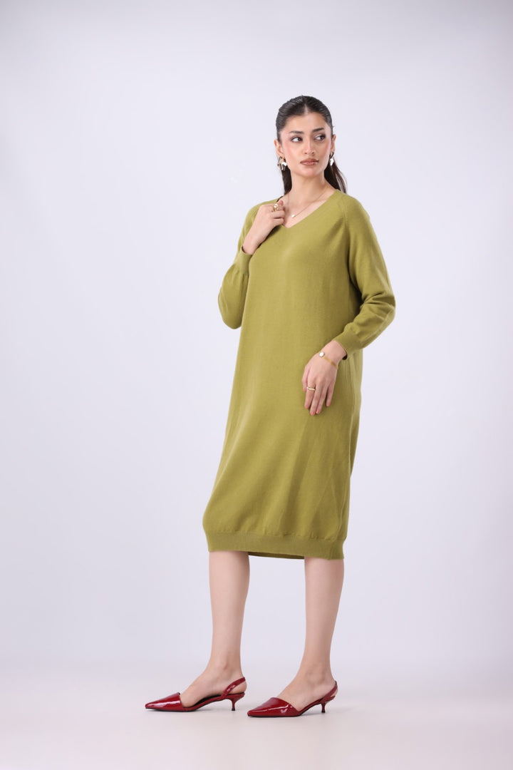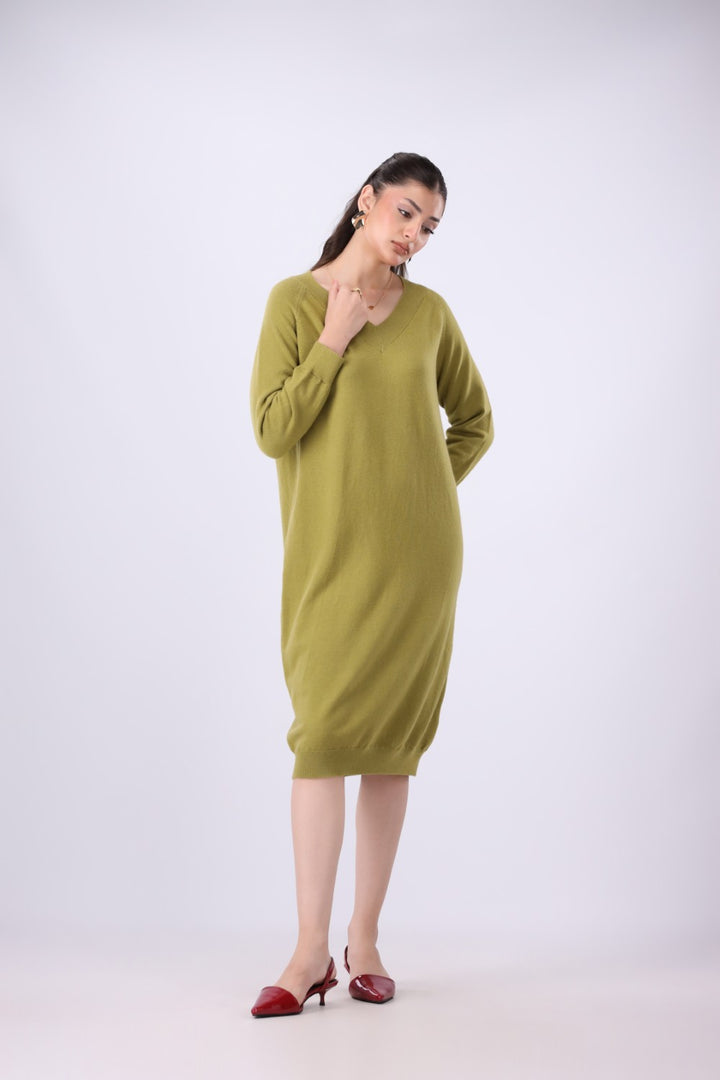 Knitted dress with a mid-length, V-neck detail, Ribbed trims and long sleeves.