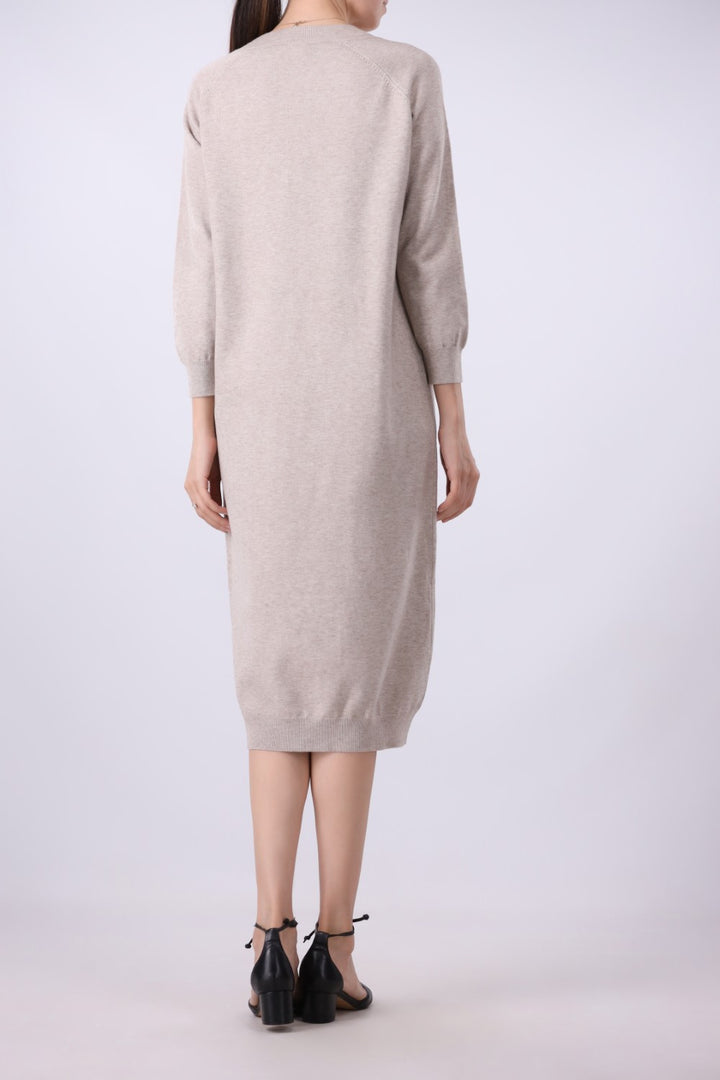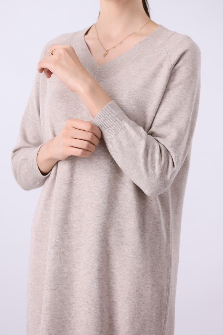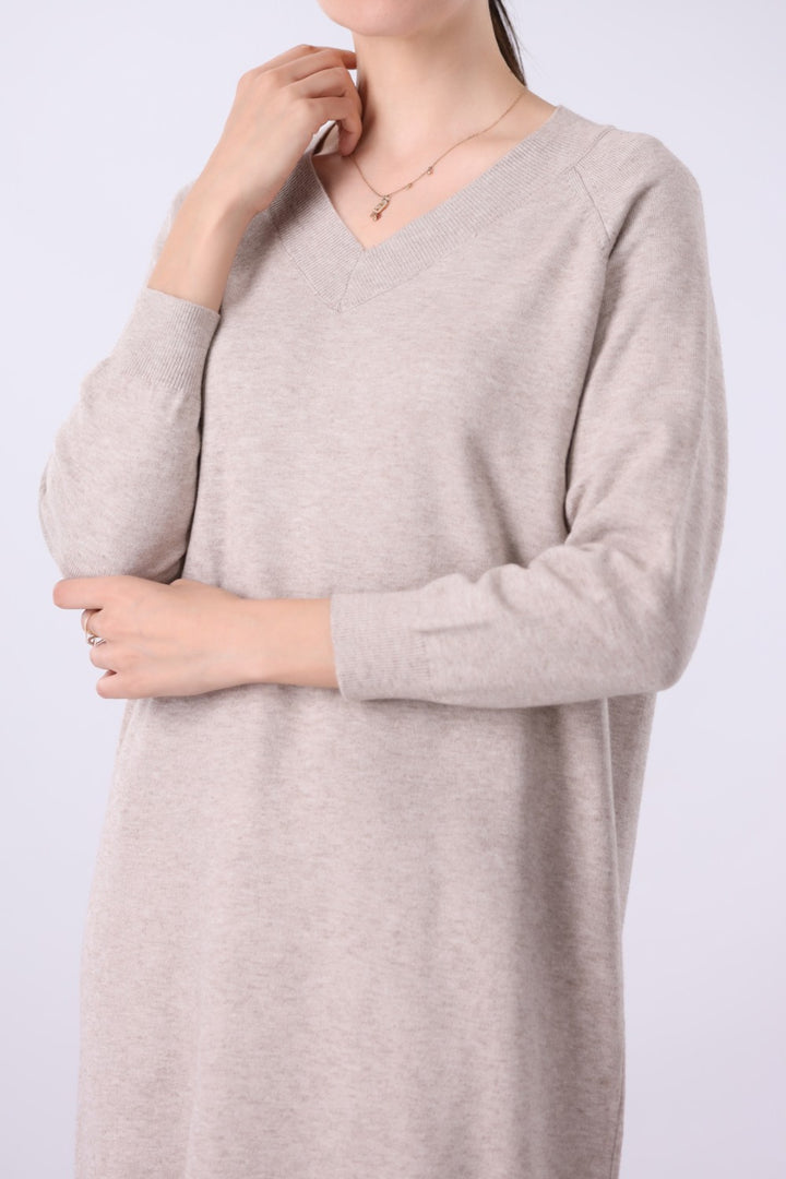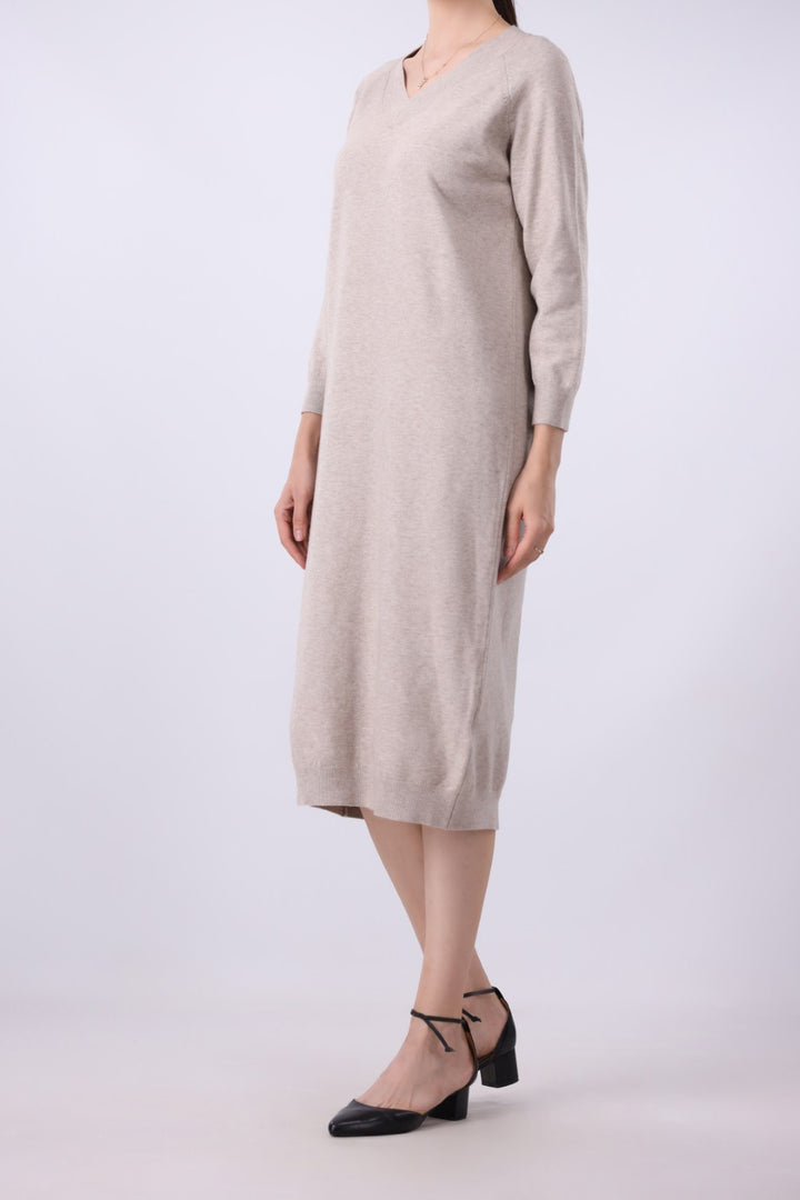 Knitted dress with a mid-length, V-neck detail, Ribbed trims and long sleeves.
