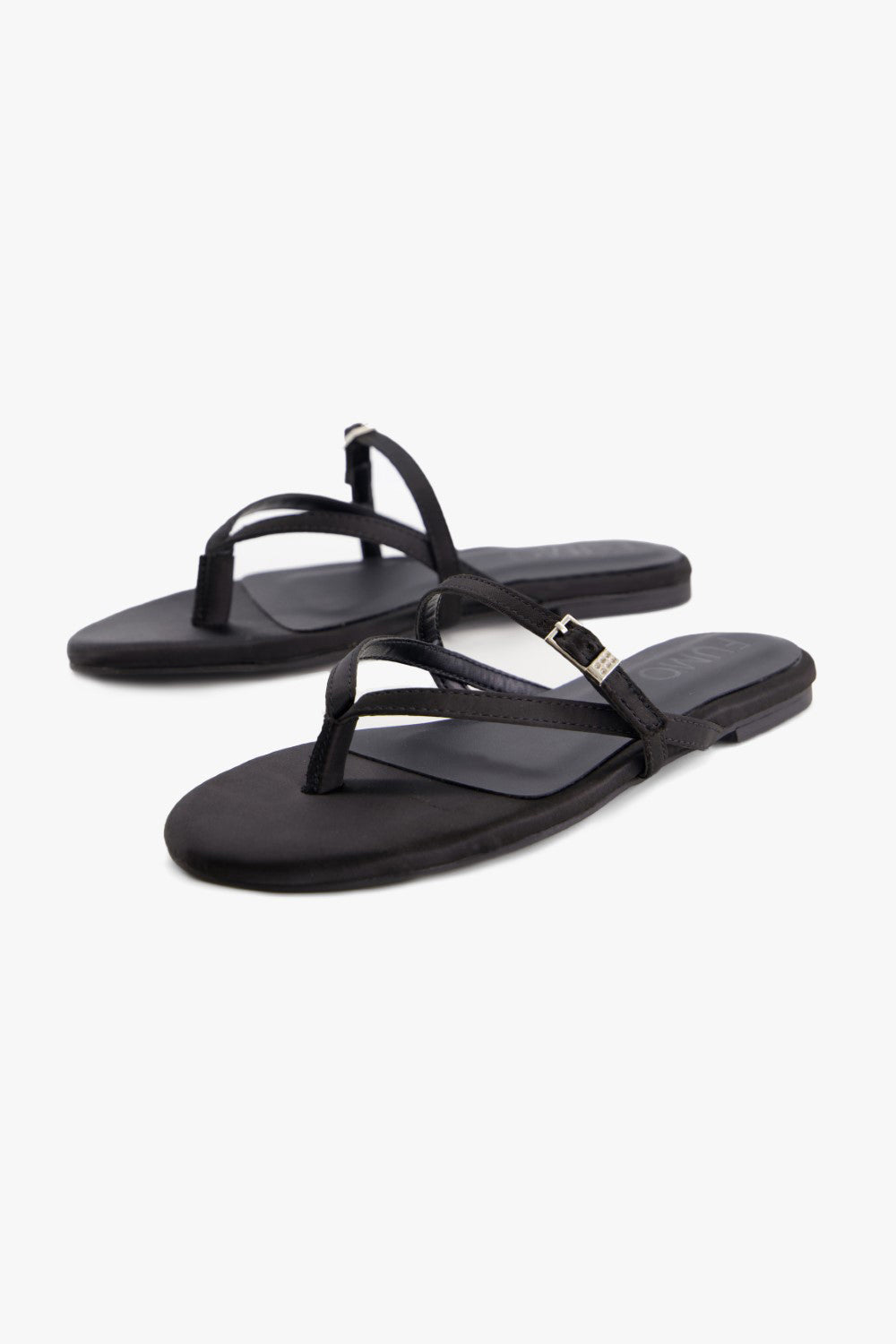An elegant take on everyday comfort, these flat satin sandals feature front straps adorned with a subtle metallic accent. With a rounded toe and smooth finish, they offer a graceful blend of softness and structure.
