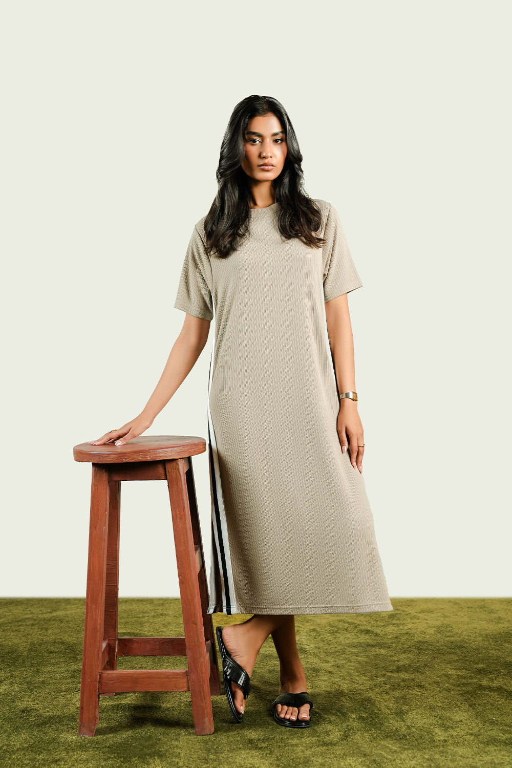 A flowing silhouette crafted in textured fabric, this loose-fit maxi dress features subtle side stripe detailing and graceful side slits for movement. Effortless yet elevated, it’s designed to drape with quiet elegance. Pair it wi