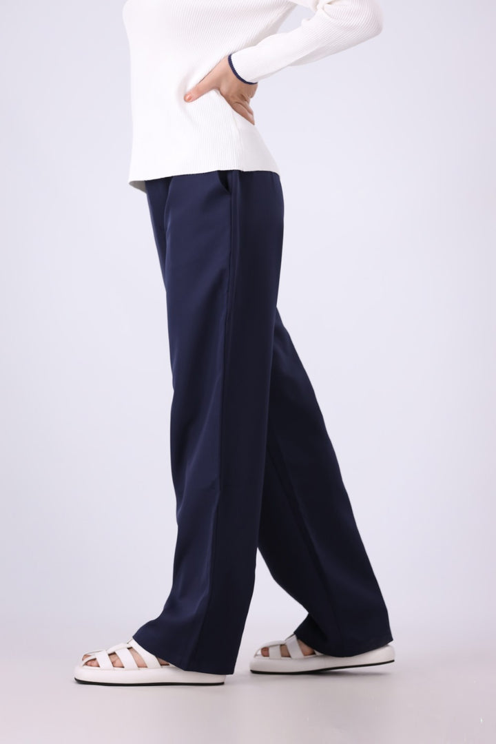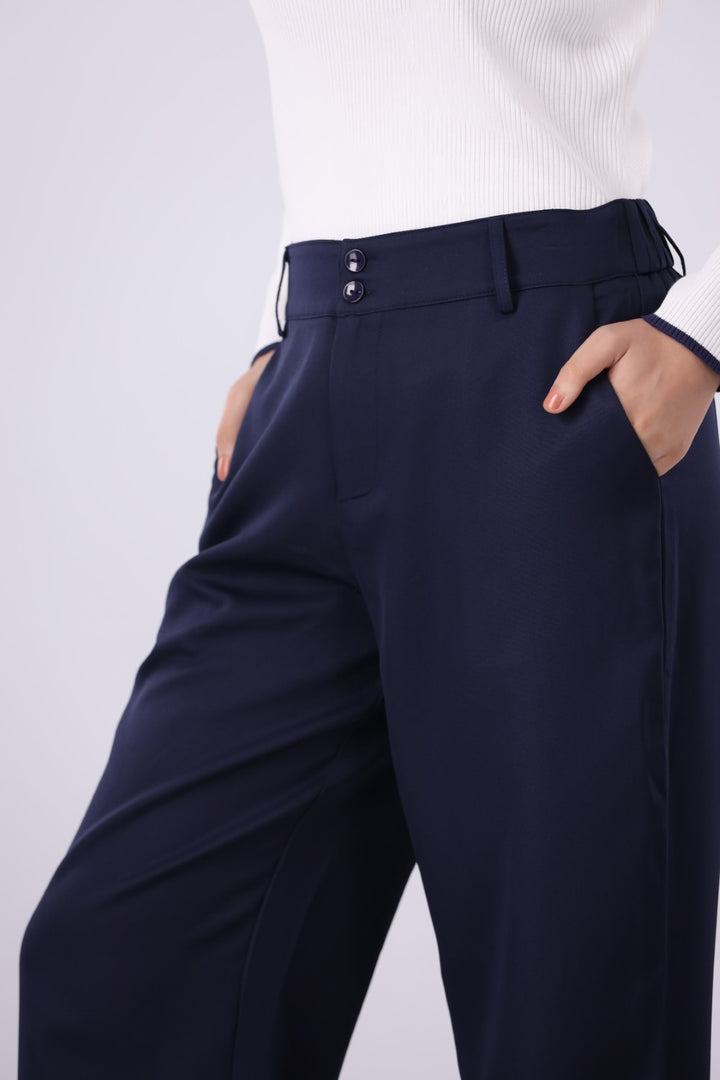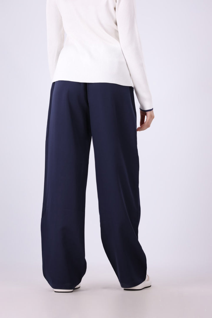 Woven wide-leg trouser with a zip fly with front button closure, side pockets and belt loops on waistband