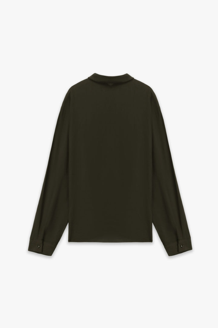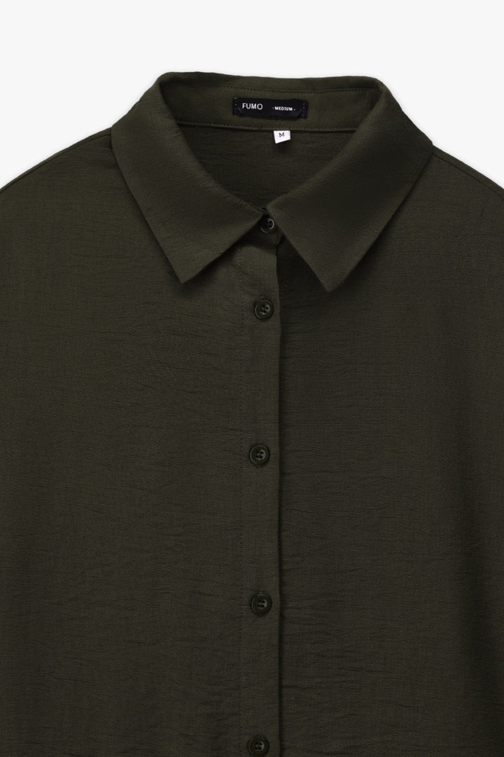 Relaxed fit woven button up shirt with regular collar, fabricated belt detail and long cuffed sleeves