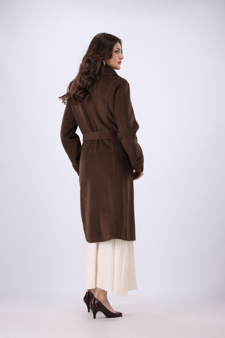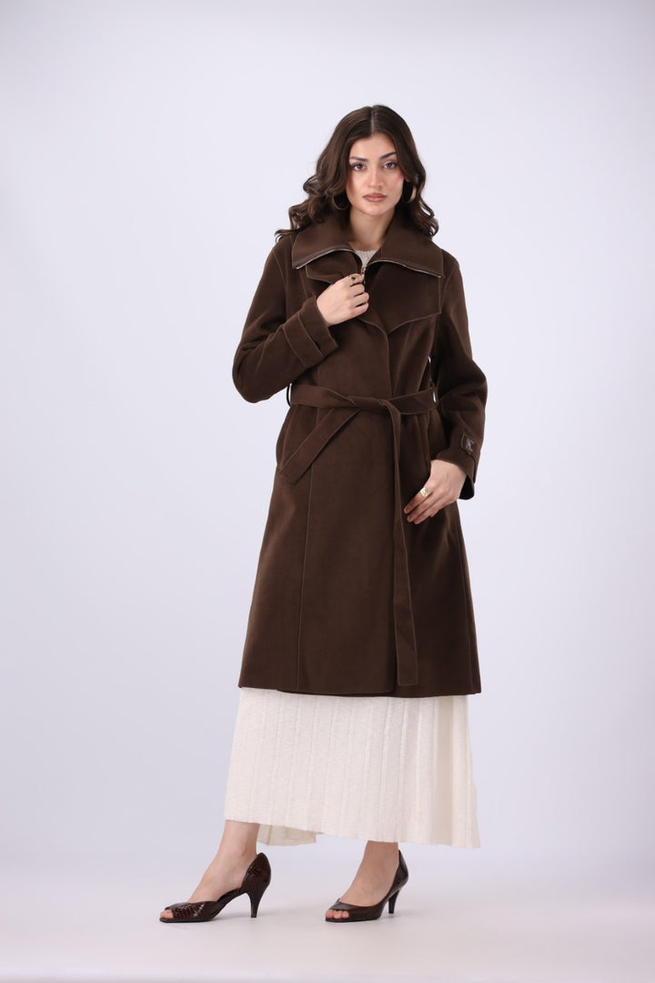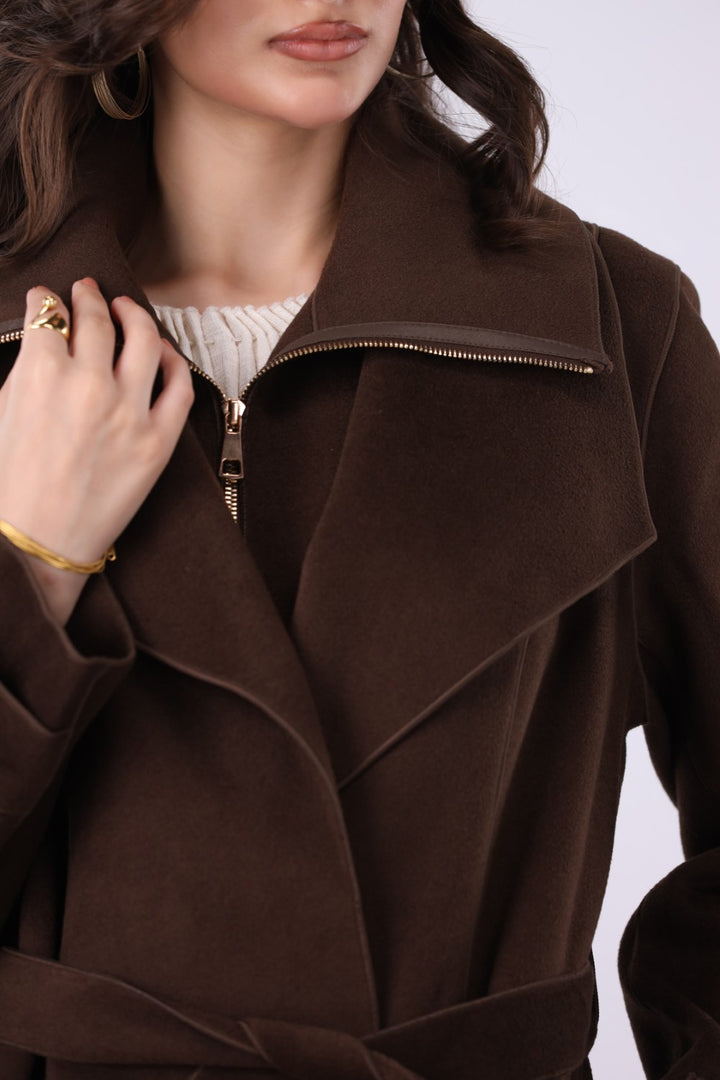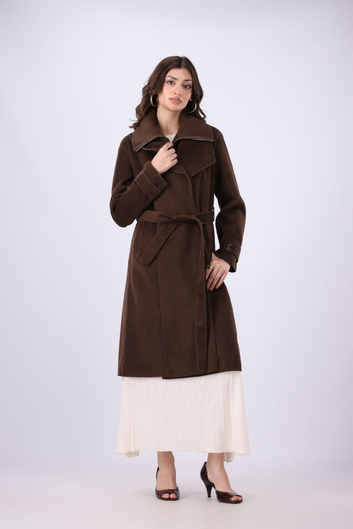 RELAXED FIT WOOL COAT WITH WRAP FRONT COLLAR, SELF-TIE BELT, WIDE LAPEL AND LONG SLEEVES